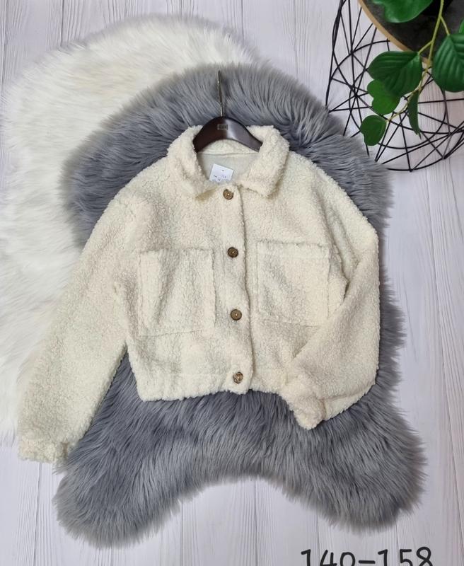 Новинка, стильный жакет из ткани букле теди, застегивается на пуговицы есть два накладных кармана, и кофема на манжетах цвет молочный Размеры 140(2 шт)-длина 40, пог 43,рукав 59/46 146(1шт)-длина 43, пог 45,рукав 64/49