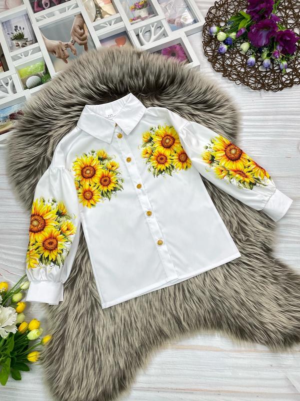 Нарядная блуза для красавиц Ткань софт, украшена красивым орнаментом, рисунок на ткани не линяет, не трескается! застегивается на пуговицы Замеры: длина / пог / кофе от горловины 116 - 45/31/47 122 - 48/33/52 128 - 51/35/54 134 - 52/35/57 аrtsanya