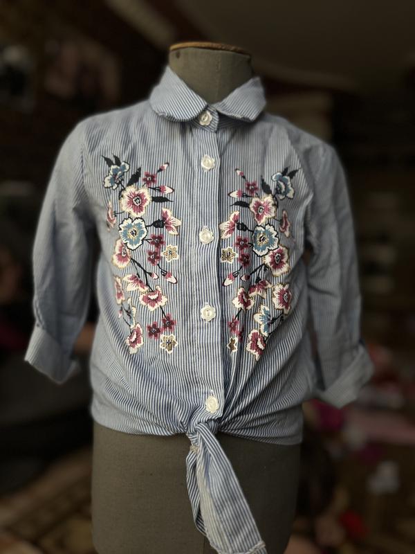 Блуза/ рубашка в полоску, голубо-белая. На завязке снизу, цветочным принтом и рукавчиком, который регулируется и на полную длину и укороченный. На 4-5 лет, размер 104-110 Замеры добавок при необходимости