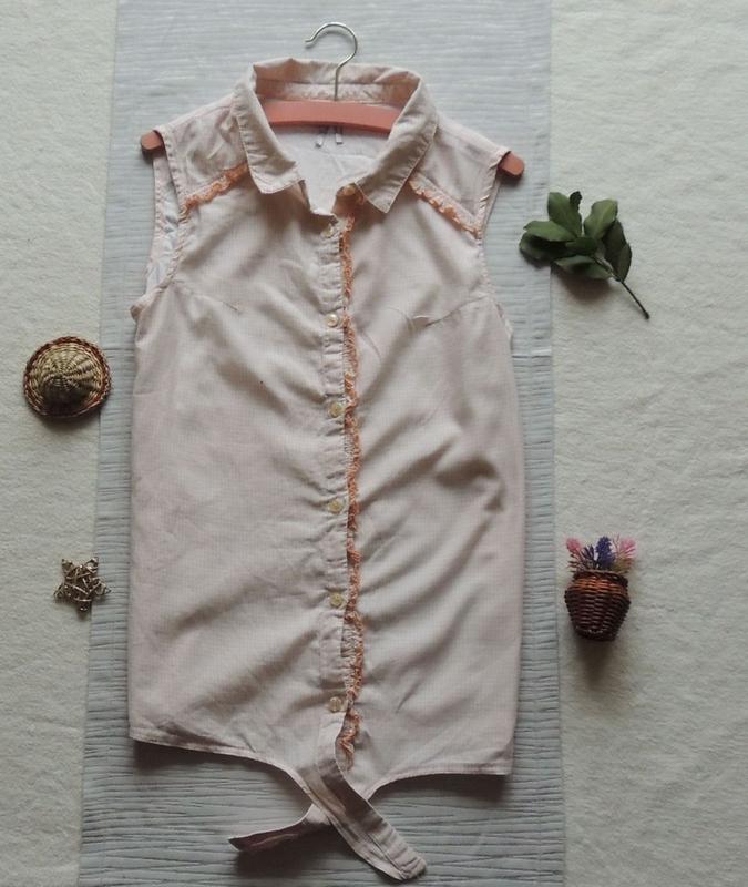 Блузка нежная коралловая бренд оркестра 14 лет В идеале под мышкой 41-46 вырез для ручки 19 плюс еще потянется высота по спинке 55 спереди по завязкам 67