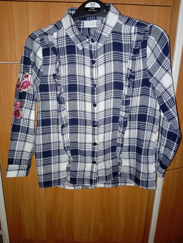 Сорочка в клітинку з вишивкою від Tesco f&f в розмірі 5-6 років. Стан ідеальний. Заміри: довжина 47, плечі 27, рукав 46/39, під грудьми 35. 100% бавовна