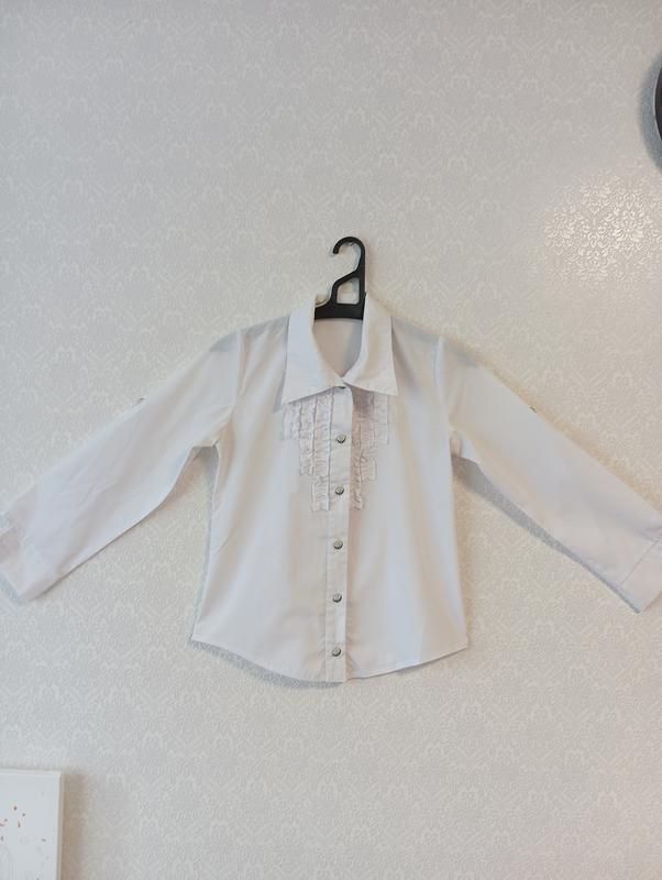 Блуза для девочки Размер 146 На фото видно, на воротнике видно недостаток-маленькая пятнышка В хорошем состоянии Длина 51 Ширина плечи 32 Длина рукава от плеча до манжета 50 (рукава регулируются можно уменьшить) Ширина в груди 42 Ширина в низу блузи 46
