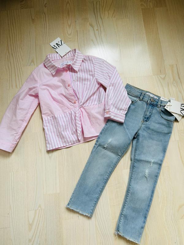 Легкая стильная рубашка Зара для девочки. Размер 4-5 р. Длина 39 см, рукав 35 см, по талии 31 см. Цена 350 грн. Отдаю дешевле, чем купила. Джинсы с потертостями Зара на 4-5 р. Зауженные. Длина 58 см, пояс 25 см. Шаг 37 см. Цена 450 грн