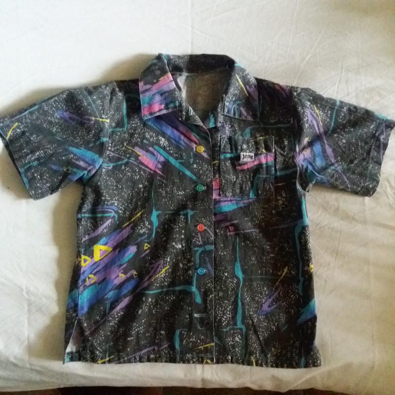 Рубашка пестрой расцветки с короткими рукавами, р.128-140 ( ширина по линии груди 39,5 см ). Материал - хлопок + полиэстер. Длина рубашки по спинке 46,5 см. Состояние на 4-.