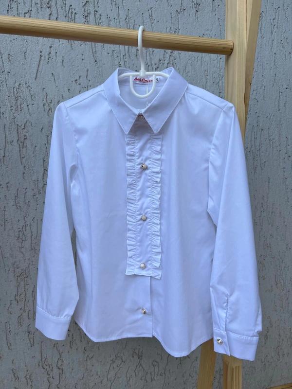 Классическая рубашка «Жабо» Распашонка хлопок (стрейч поплин), ткань премиум сегмента Крой классический, полуприлегающий Отложной классический воротник и манжеты Центральная застежка на пуговицах Декор - жабо (снимается), набитые петли, застегиваются на пуговицах по переду рубашки цвет белый Размеры полномерные 146 152- 158- 164 аrtchild