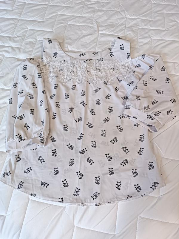 Белая блуза с принтом в школу. Подойдет на маленькую девочку с размером xs/s. Рукав на резинке и имеет открытые плечи. Имеет сетевую вставку выше района груди. Замеры метром на фотографиях****