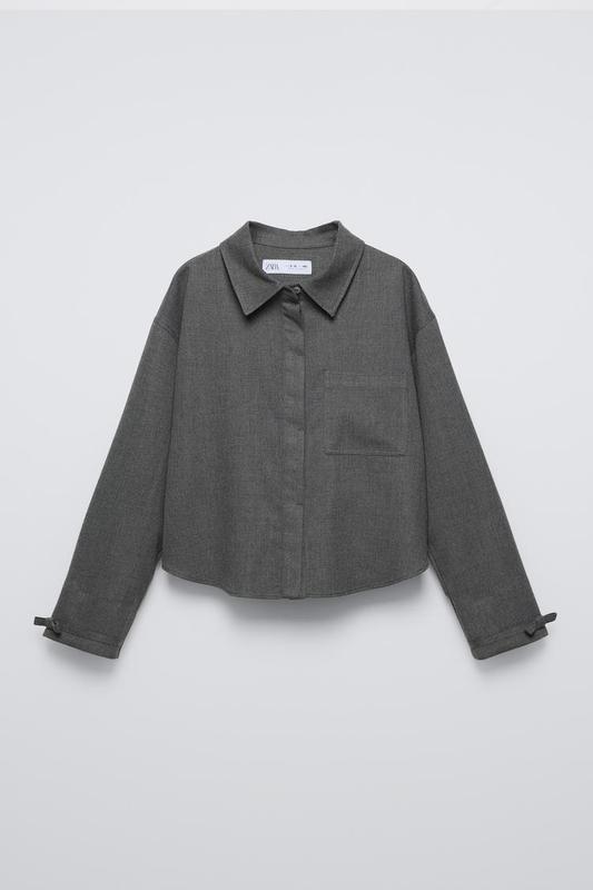 Рубашка с классическим воротником и длинными рукавами, украшена аппликацией бант. Застежка на пуговицы спереди. Имеет накладной карман на груди
