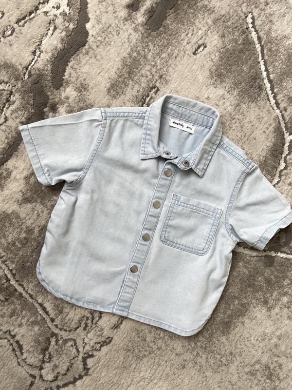Сорочка джинсова з комірцем (унісекс) на кнопках Заміри: Обʼєм грудей 32 см Висота від верхньої точки плеча до низу 33 см Рукав 12 см Розмір: 80 см Колір: блакитний Стан: ідеальний