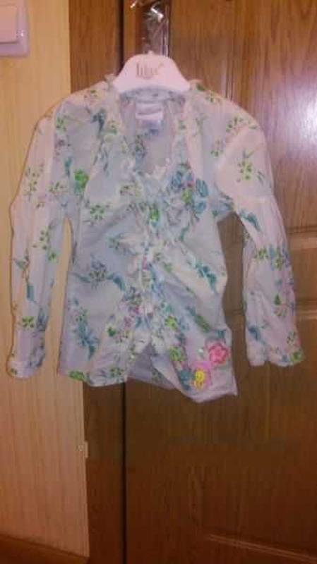 Классная лёгкая рубашка на девочку. Красиво смотрится под джинсы. Длина по спинке 41 см, ширина под руками 32 см, рукав 33 см.