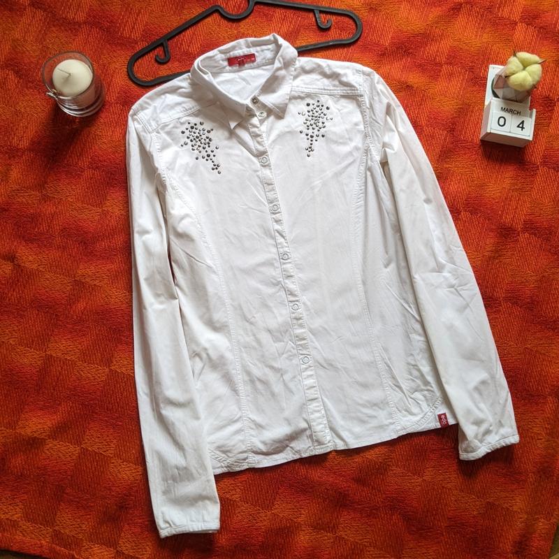 сорочка белая рубашка интересного фасона из хлопка размер по этикетке 16 лет это явное преувеличение и можно пробовать 14 под мышкой в спокойном состоянии 45м тянуть до 55 линия плеч 39 рук от плечевого шва 62 см от подмышки 50 длина по спинке в два раза без учета ворота 61 стан очень хороший дефектов не виявлено.