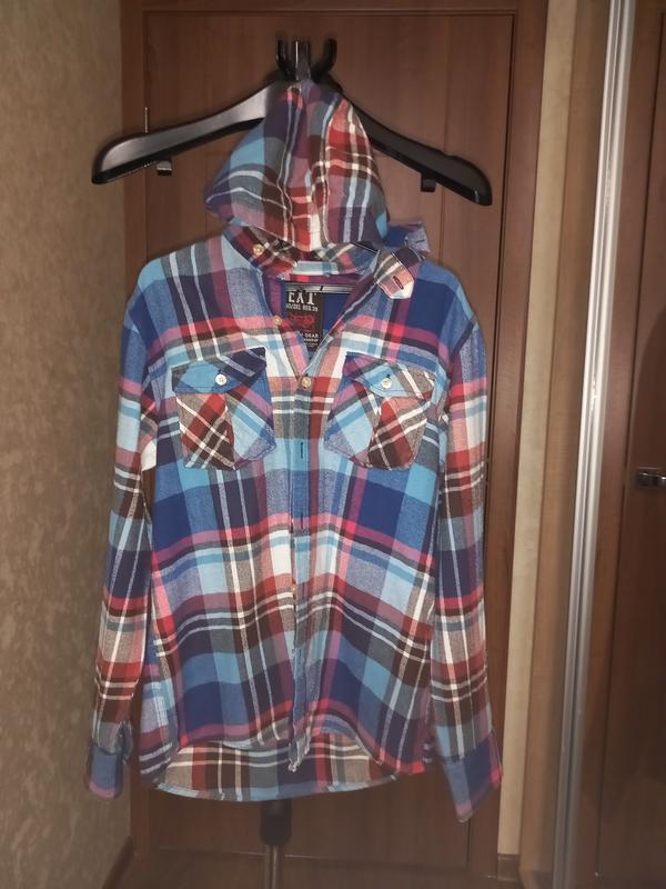 Продам рубашку с капюшоном. Размер написан 11 лет. Замеры длина 61 см длина рукава 54 см рукав можно уменьшить пуговичкой плечо 12 см ширина полуобхват под мышками 46 см. Есть немного пятнышки показала на фото.