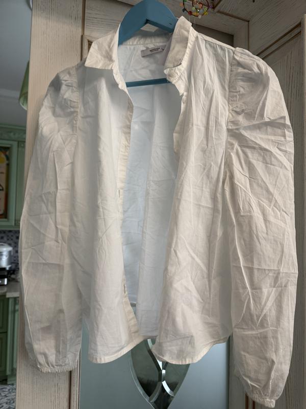 Рубашка білого кольору з рукавом фонариком. Довжина 57, рукав на рещтночці 59. Пог 49