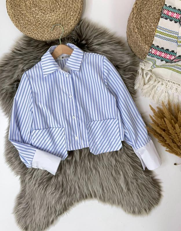 через кнопку купить только полная оплата!!! Арт 5264 Бавовняна сорочка в голубую полоску с модными кармашками на пуговицах и с красивыми манжетами Рекомендую ! рост/длина по переду/пог/рукав от горловины с манжетом похибка +-2см 140-146/39/43/60-1шт