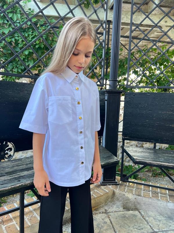 Зріст моделі: 136 Сорочка у розмірі: 134 сорочка для школи з коротким рукавом, на зручних кнопках! А ще спереду є стильна діюча кишеня — для дрібниць та гарного настрою Тканина: поплін Колір: білий Заміри: 128 сорочка довжина по спинці 51 ширина 40 134 сорочка довжина по спинці 53 ширина 42 140 сорочка довжина по спинці 55 ширина 44 146 сорочка довжина по спинці 57 ширина 46 152 сорочка довжина по спинці 59 ширина 48 158: довжина по спинці 61, ширина(пог) 49