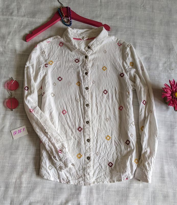 Якісна сорочечка whites Staff розмір самий менший жіночий 34 XS виглядає як розмір +- 13 років не більше підмишки 41 до 45 лінія плечей 36 рукав від плечового шва 54 довжина по спинці двоє без врахування горловини 59 максимально дуже красиво розшита дотик, неймовірна тканина з тісненням та вишивкою по всьому периметру