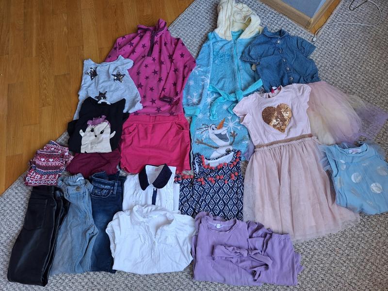 Набор одежды для девочки в котором есть две блузки в школу короткий длинный рукав в отличном состоянии без нюансов также флисовая кофточка на холодное время года реглан с длинным рукавом также двое джинсов и лосины под кожу халат ванное холодное сердце также подойдет на холодное время года дома ходить и несколько плать все на фото, что будет входить набор. Комплект классный который закроет основные потребности для девочки школьного возраста. Также в наборе есть костюмчик лосины туника и повязочка на голову Пересилаю. Есть брендовые вещи такие как Oshkosh, next, marks & spencer, h&m
