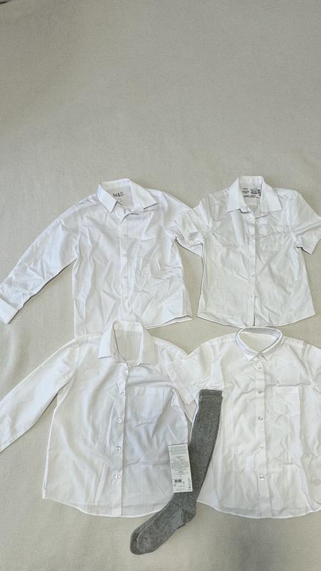 Сорочки білі нові, з бавовни. Ідеальні в школу. Купувала упаковками, то по 1 залишилося. Верхні - M&S 6-7 років Нижні - George 7-8 років Гольфи (підколінки) Некст, розмір 31-36 - 90 грн.