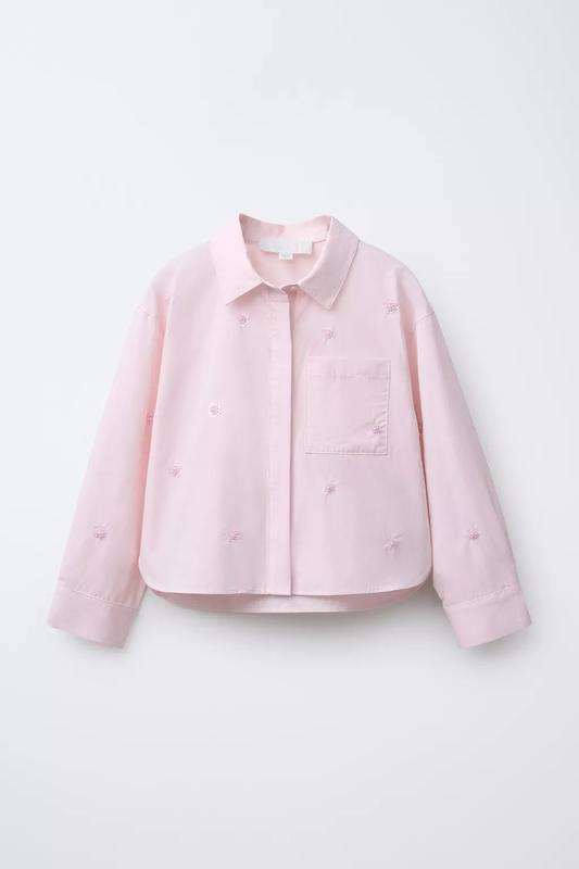 Сорочка з коміром сорочкового типу та довгими рукавами. Застібка на ґудзики спереду, прихована планкою. Нагрудна накладна кишеня. Аплікація з бісеру у формі квітки. БЛІДО-РОЖЕВИЙ | 4786/740/622