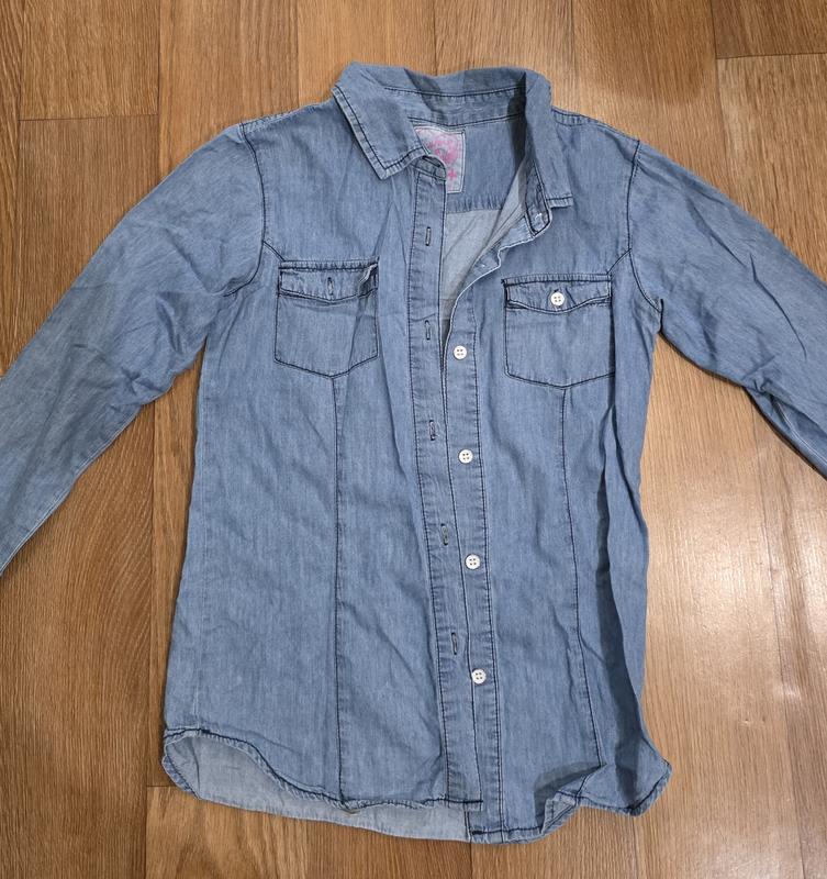 Джинсовая рубашка для девочки. Стан хороший. Замеры: длина 58, рукав 55, ширина 38.