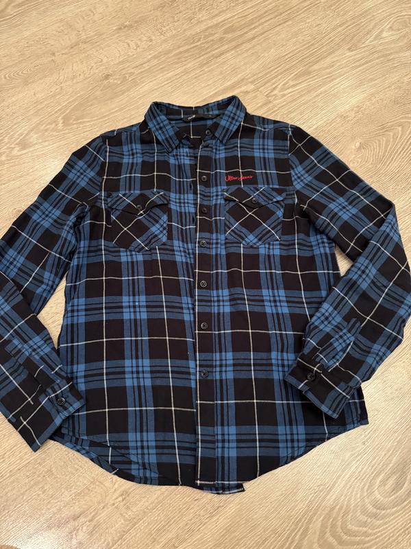 Сорочка розмір 34 XS S, чорно-синього кольору на ґудзиках. З двома кишенями на грудях. Довжина виробу 64 см. Пів обхват грудей 43 см. Пів обхват талії 43 см. Рукав 56 см.