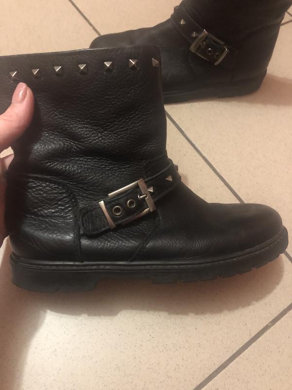 Чобітки шкіряні на байці у гарному стані без дефектів. Розмір 33. По устілці 20см. З стильними закльопками і широким верхом, Дуже зручні,саме те що треба для весни та осені.