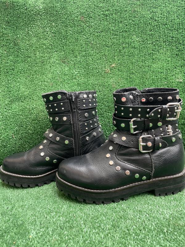 Чобітки фірми Zara, б/у. Натуральна шкіра. Присутні потертості на носочках, та потертості на п‘яточці внутрішньої частини, не вистачає маленької закльопки біля замка. Устілка 17,5см