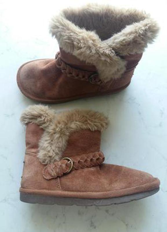 Демисезонные сапоги угги NEXT 32 размер из плотного экозамша, украшены ремешками изкосички. Износ не значительный, не сбиты, не счесаны. Подойдут на ножку 32 размера, стелька 21 см. По международной размерной сетке такие размеры: Британский 1 украинский 32