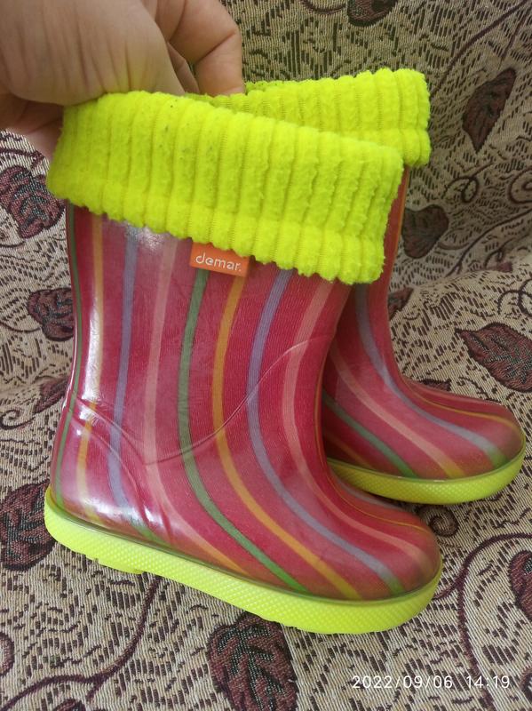 Резинові чобітки фірми Demar. У відмінному стані без дефектів, після моєї донечки. Мають змінний утеплений панчіх з поліестеру( повністю цілий не рваний, без дефектів). Устілка 14.5 см.