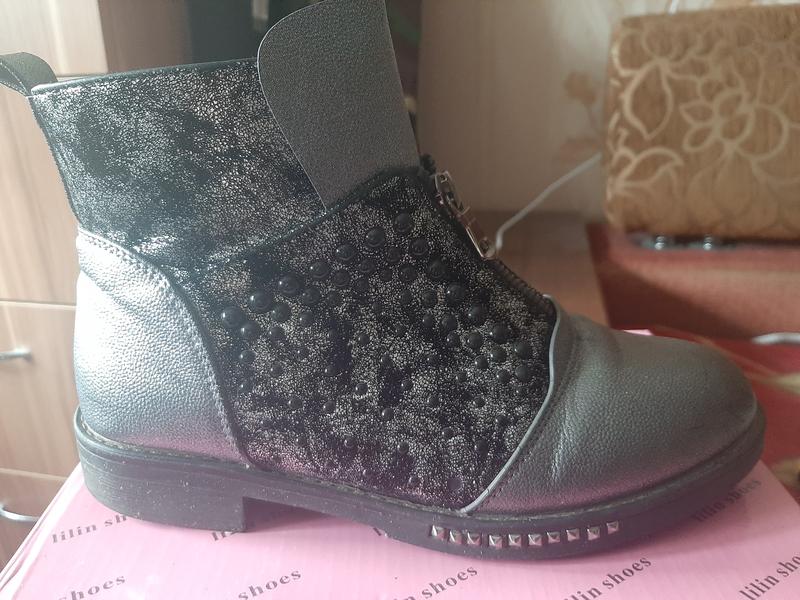 Демі ботинки на дівчинку б/в. Колір -графіт з напиленням срібним. Стан добрий. Підкладка -тоненьке хутро. Нюанс- камінчики деякі відсутні з внутрішньої сторони фото 2,3. Ціна 200 , торг.