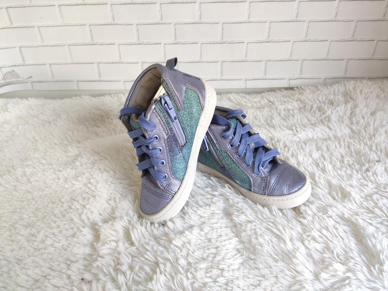 очень красиво сверкают! отличный цвет. размер указан 25. полная длина стельки 15,5см. есть немного потертостей по бокам, сверху. не заметно абсолютно.