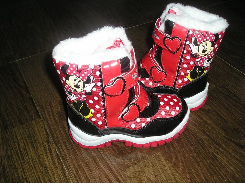 Новые термо сапожки Минни Маус с бирками. Сток. есть небольшой ньюанс, в некоторых местах подошвы белая часть пожелтела. в цене это учитывалось. доп фото по запросу в наличии р 8-17см по стельке(2шт) р11 -20. 2см по стельке(1шт.)