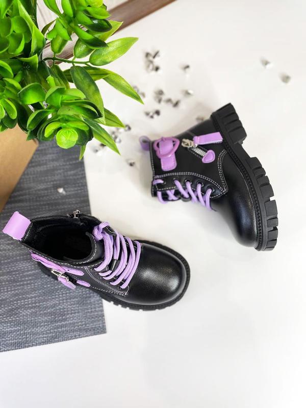 💜 Стильнячі ботіночки для дівчат💜 Дизайн та поєднання кольорів чорного з ліловим - це ван лав😍. Фіксуються за допомогою шнурівки + збоку блискавка. Усередині підкладка фліс. Устілка фліс. 😃Знайшли на складі останню коробочку такої моделі 😃 750грн 27р. - 16,5см 28р. - 17,0см ❗ Вимірювання зроблено всередині по устілці особисто мною, похибка 1-2мм допустима.