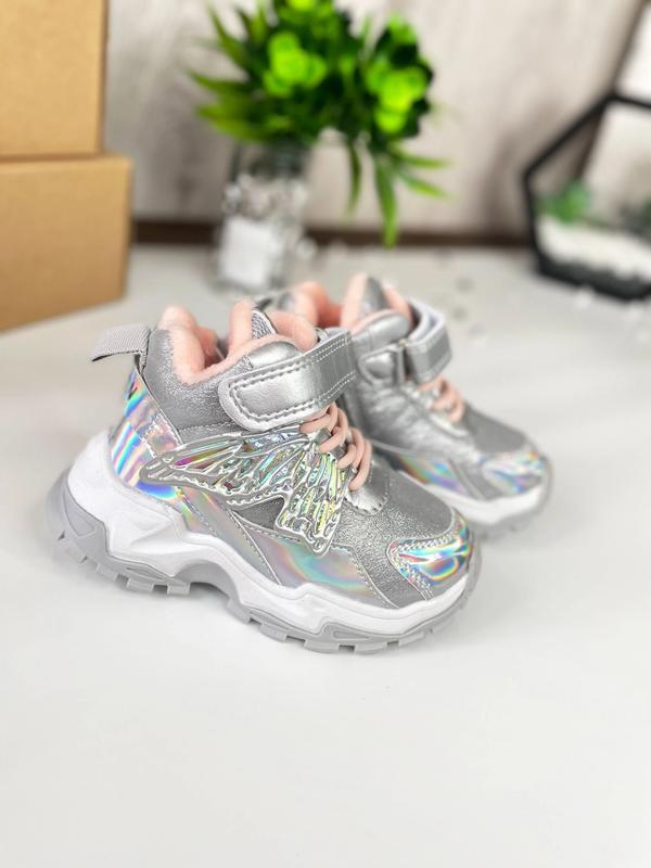 💎 🦋 Модні сріблясті хайтопи з крилами.💎 Усередині утеплені флісом. За допомогою липучки можна регулювати обхват ніжки. Збоку є блискавка. Резинка – імітація шнурка. Устілка шкіряна із супінатором 22р. - 13,8см 24р. - 14,8см