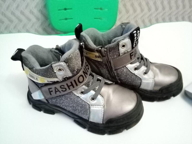 дуже гарні осінні ботіночки, загальний стан дуже гарний, є незначна потертість біля замку, в носці не видно. всередині фліс, устілка 19см