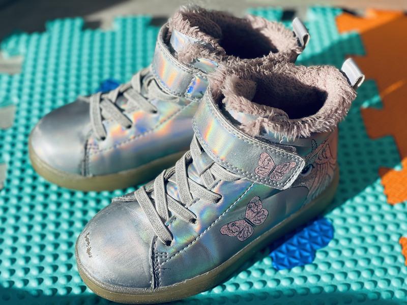 🔥🔥🔥 Розпродаж, щоб місце не займали в шафі 👍 Н&М хайтопи срібні, утеплені. На підошві вогники блимають під час ходи. Розмір 28 Довжина по устілці 17,5- 18 см. Стан дуже хороший, окрім стрертих передків. Донька стерла майже зразу, так бігала, ходили в таких в садочок. Резиночки добре тянуться по ніжці, липучки в дуже гарному стані. Підошва не стерта.