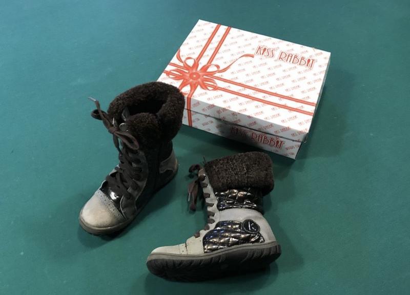Сапожки кожаные на овчине KISS Rabbit. Р. 29. Длина стельки -19 см. Стелька - овчина. Сбоку застёгиваются на молнию. Спереди шнуровка, можно регулировать полноту. Из нюансов : подклеен лаковый декор