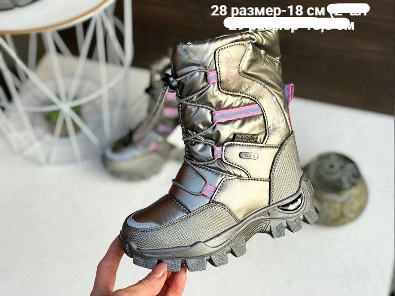 Зимние дутики от фирмы Тоm.m Стильный дизайн Очень теплые и удобные.До - 30' мороза Верх из непромокаемой и непродуваемой плащевки Внутри-теплейший мех (60%натур) Сбоку на молнии. С защитой от протекания Прочная подошва БРОНЗА 28 размер-18 см