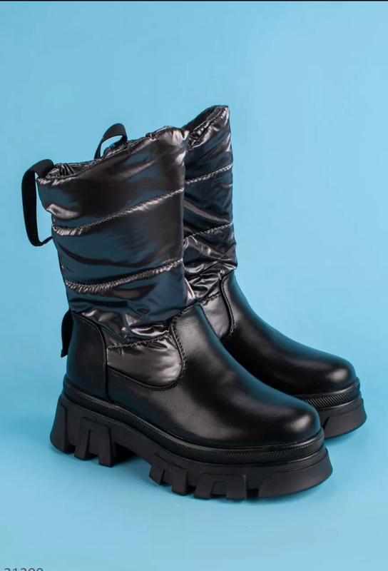 Колір - чорний Материл верху - штучна шкіра, плащівка Утеплювач - хутро Підошва - ПВХ Застібка - змійка Дод. інформація - Висота підошви - 4см, висота сапога - 23 см Розмірна сітка: 32-37 розмір Заміри по устилці: 32 розмір 20,5 см 33 розмір 21 см 34 розмір 21,5 см 35 розмір 22 см 36 розмір 22,5 см 37 розмір 23,5 см