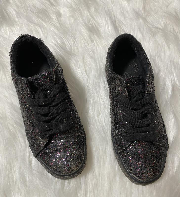 Фото на тілі нема Застібається на шнурки Посипані блистками Є нюанси-потертості і носики трохи відклеілись,заклеїли можна і за рахунок блисток потертості непомітно Нюанси у ціні враховано Продається так як є без притензій і без повернення Устілька 21 см) Висота 7 см) Ширина підошви 8 см)