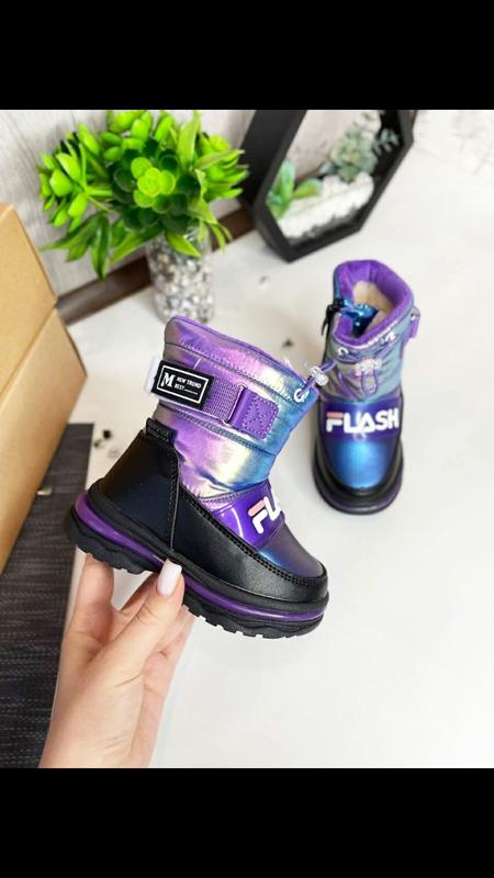 💜 Фіолетові хамелеончики😍 Матеріал верху - еко.шкіра + термоматеріал, непродувний та водовідштовхуючий. Збоку на блискавці з захистом від попадання вологи, зверху утяжка. Усередині утеплені овчиною (60% натур.). 23р. - 15,0см 24р. - 15,6см 25р. - 16,3см 26р. - 17,0см 27р. - 17,5см 28р. - 18,1см
