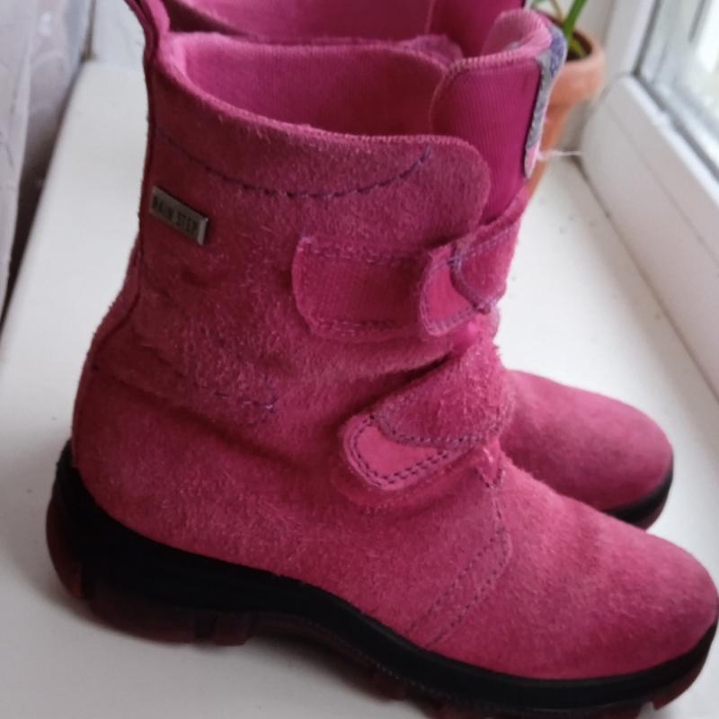 Красивые прочные ботиночки для девочки. Натуральная замша!Стан практически идеален, единственное что надо качественно почистить замш, возможно освежить цвет.Внутри утепленные, похоже набивная шерсть, есть фото.Липучки не изношенные держат хорошо, все целое!Стельки 16,5.