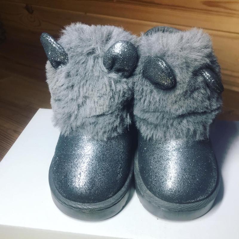 Угги,м’якенькі, легкі! Серединка - густе штучне хутро, зовні декоровані м’якеньким хутром та вушками. Без застібок, взув і пішов. Розмір 26 ( на стопу 16,2 см) Стан нових