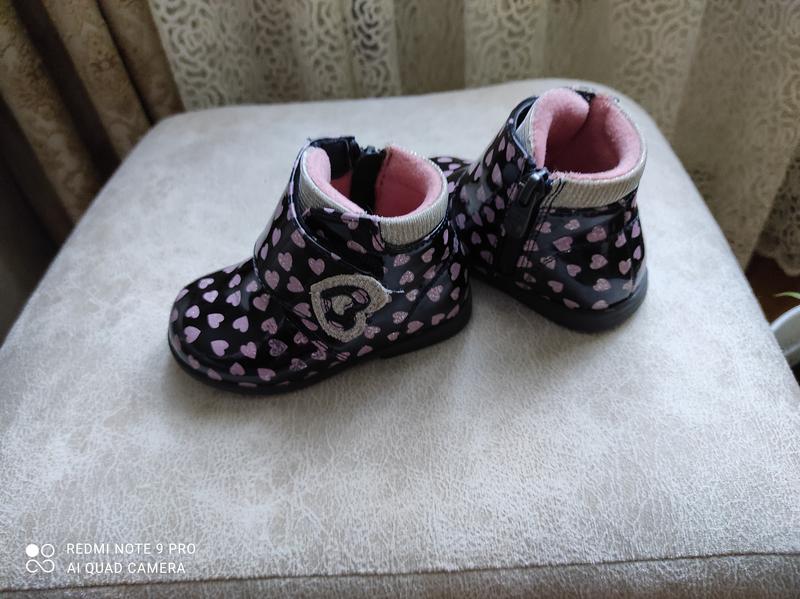 Ботинки на девочку (весна,осень)р. 20. Цвет синий в сердечки. Внутри на байке. На замочек. С внешней стороны липучка. Незначительные затертости спереди( последнее фото)