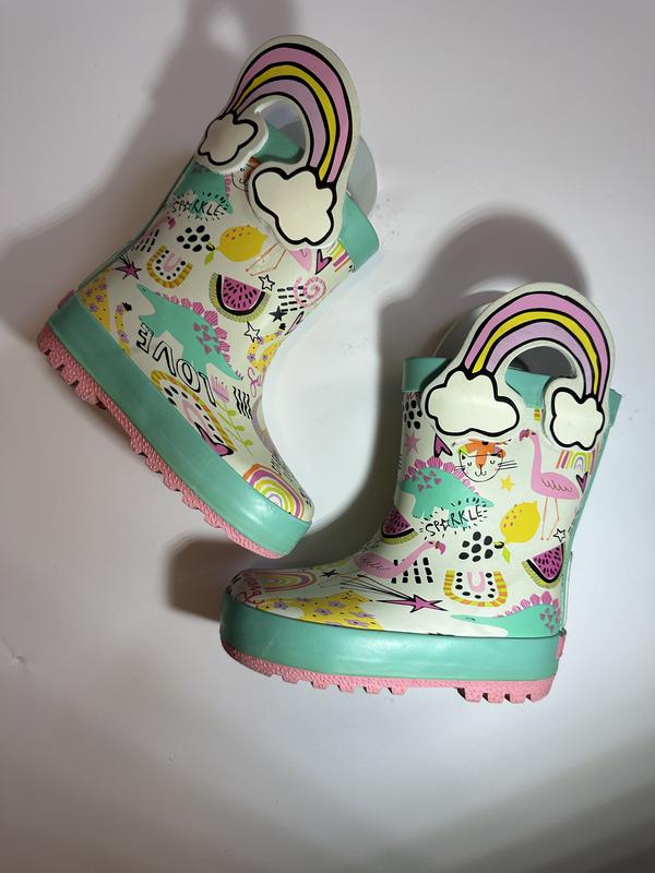 Резиновые сапожки на девочку для прыжков по лужам) Стан очень хорош. Размер 5, 21,5 -22 украинский. Очень яркие, дочь любила носить даже дома. Внутри на флисе.