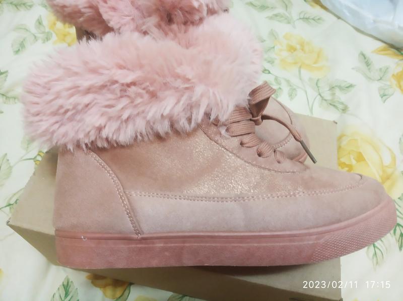 Красивые легкие ботиночки-кеды на девочку -подростка, с розовой опушкой, на шнурочках. Из искусственной замши, флисовая подкладка. Вся стелька 24,6 см. На 38 размер.(хотя пишут 39). Одеты однажды. Состояние новых.