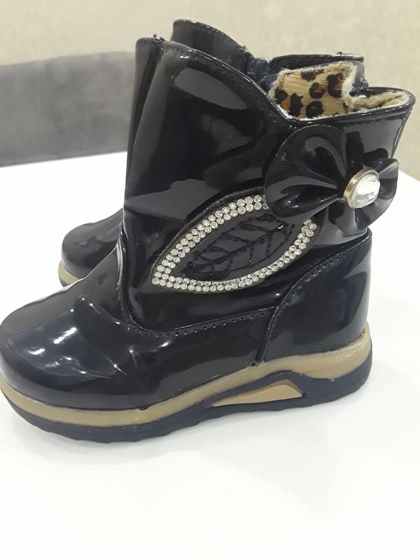 Очень хороши ботинки отделаны камушками, искусственная лаковая кожа, стелька 14 см. На одном есть маленькая миллиметровая царапинка, при носке не заметно. Носились очень мало.
