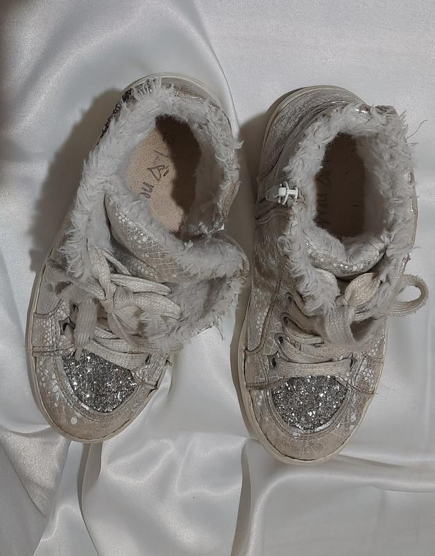 Ботинки фирмы Next, бур. Вьетнам. Размер 13, EUR 31. На замок и шнуровку. Декорированы блестками, серебряные. Эко кожа. Состояние удовлетворительно.