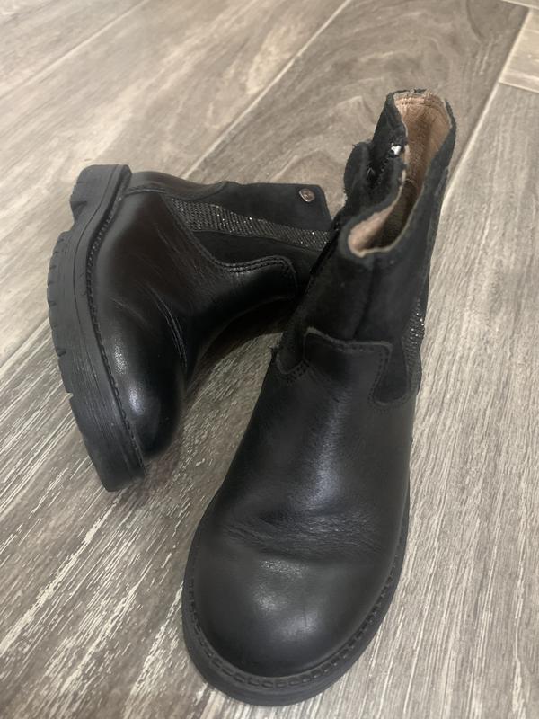 черевики демі, шкіра + замш , з нюансів немає декілька камінчиків, можна наклеіти або зафарбувати чорним фломастером, устілка 15 см , розмір 24. Носки не затерті