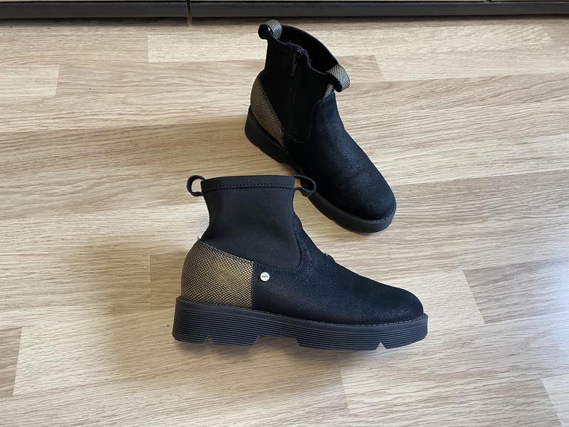 Ботинки натуральная замша с пропиткой ,очень мелкая структура,эффект почти гладкой,задник с золотистой пропиткой,голенище стрейчевый носок,внутри шерстяной утеплитель,стильные,удобные,не тяжёлые,размер 33, стелька 21,5 см