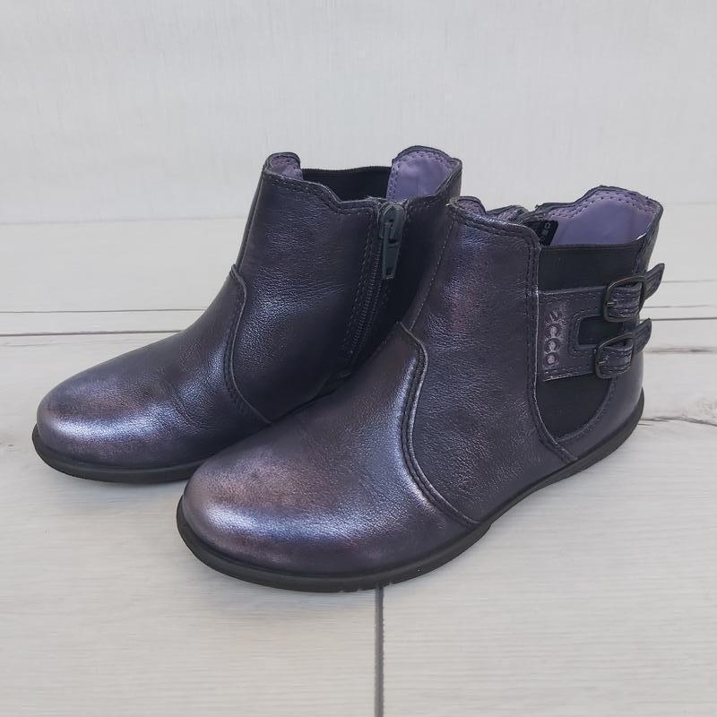 Демисезонные ботинки Ecco для девочки, р. 27. Размер 27. Длина стельки от начала до конца 18-18,1 см. Материал: натуральная кожа. Цвет: темно фиолетовый (ближе к черному) с серебром с эффектом потертостей. На широкую ногу или большой подъем не подойдут. Состояние: Новые. Переросли, были обуты 1 раз по квартире на пол часа. Оплата на карту. Пересылка Новой почтой, Укрпочтой за счет покупателя. Возврат не предусмотрен.